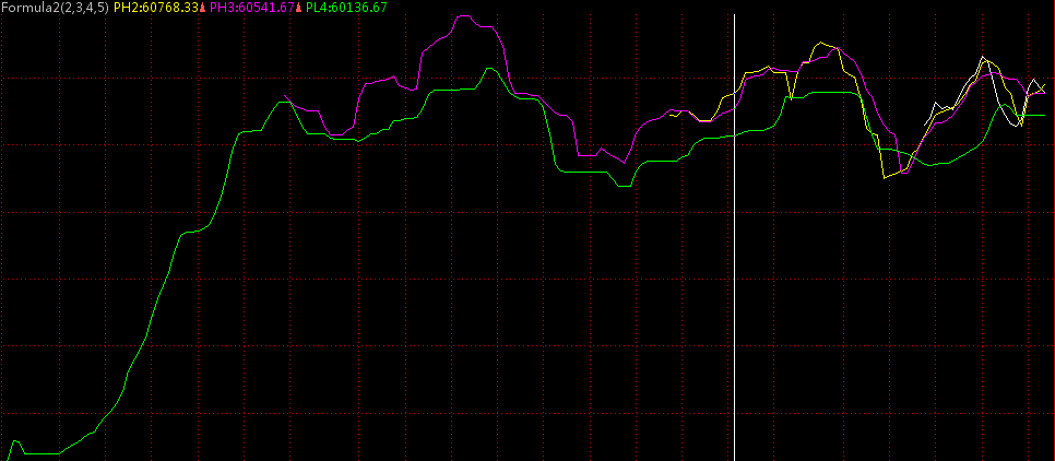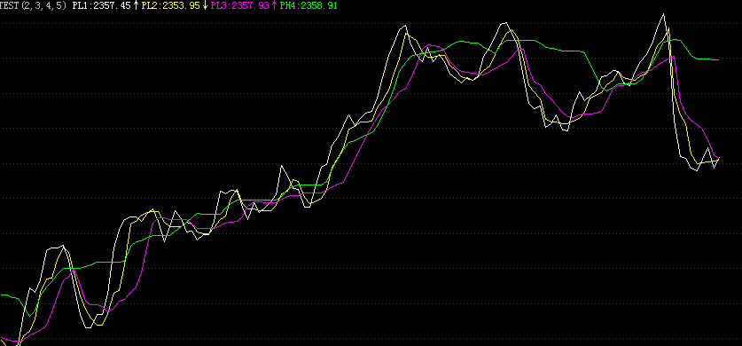 上面两图中,是在60分钟周期时,白色线是5分钟数据,黄色线是15分钟数据,粉红色线是30分钟数据,绿色线是60分钟数据,飞狐中可以完全显示所有数据线,而金字塔中5分钟数据只有一小段,15分钟数据也只有一段,30分钟也只有一段,只有60分钟才是完整的,只有在工具选项里图形显示(0)周期数据才会有完整的数据,但是有一个问题,即然60分钟数据是由5分钟数据生成的,为什么有完整的60分钟数据而5分钟数据不完整,显然是在图形处理时把数据再处理一编才造成的,这里有画蛇添足的味道。
