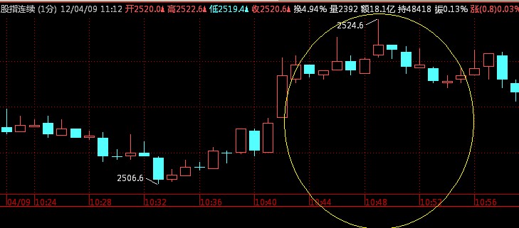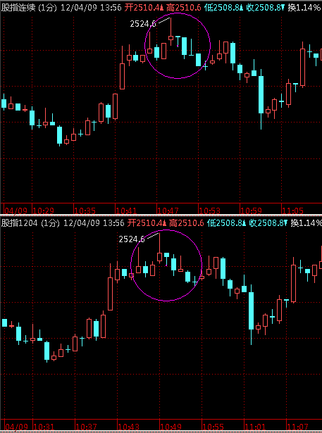 这是今天上午10点50左右这一截的对比图,同一框架下股指连续和股指04,仔细看圈圈内没有一根是相同的。