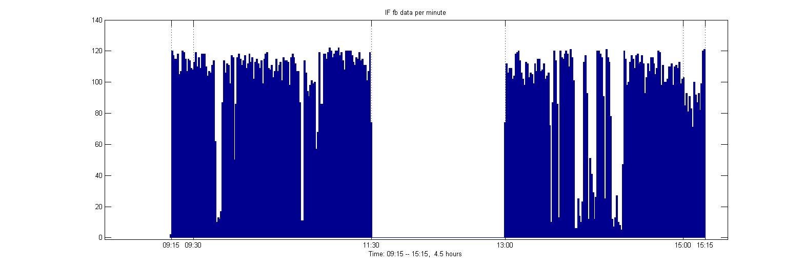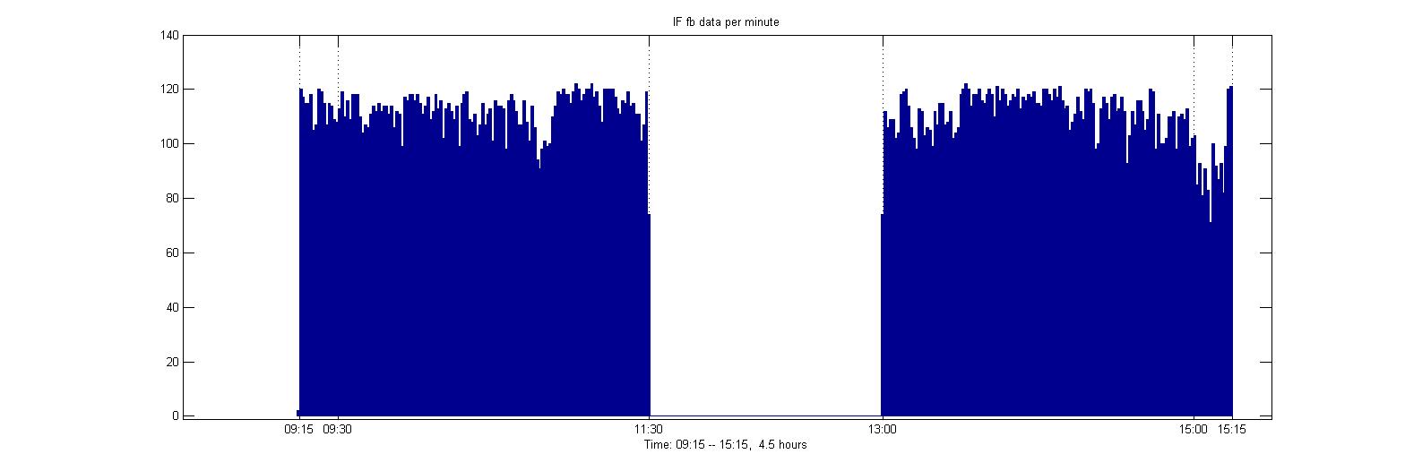 支持lz,还是希望金字塔越做越好。我也上两张图,是盘后股指连续的分笔数据每分钟的笔数。电信的两个服务器的数据都挺好,网通的两个服务器都不行,明显可以看出来中间有丢数据的情况。