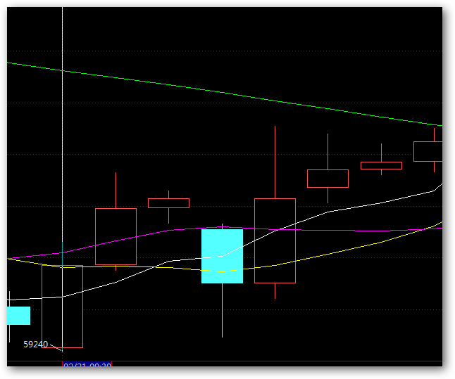 这是2月21日博易大师的铜连三的30分钟K线,从9:30的那根K线可知,显示那天开盘59300,高59700,低59280,收59610,我知道金字塔和博易的30分钟K线的时段计算不同,但是不影响第一根30分钟K线,但那天的开盘价不应该差50点啊,求哪位解释一下,我正在验证系统,金字塔的数据很详细,我很喜欢,但金字塔和博易的行情数据不一致,那我也白玩了,都是徒劳。