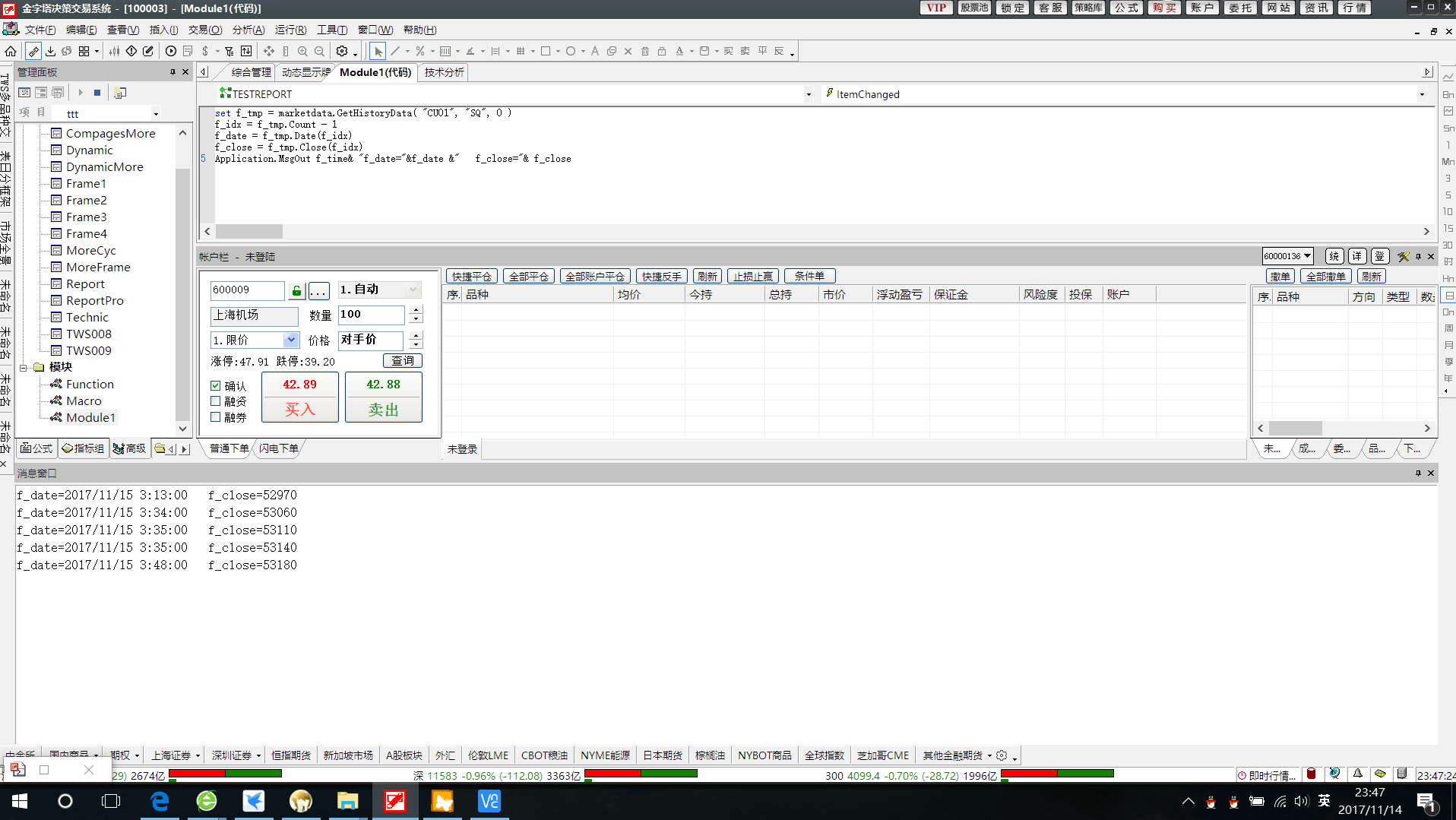 在VBA中,我需要在定时器中,每隔一分钟,取所有品种的上一分钟的收盘价实时信息,用了下面的代码