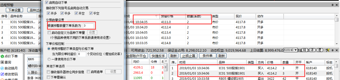 2、本地用5.02测试了下,服务端委托手数为2,客户端系数为3,客户端实际下单手数为6 ; 远程预警上显示的是服务端策略的数量,而客户端系数实际为服务端数量的倍数,如下图;