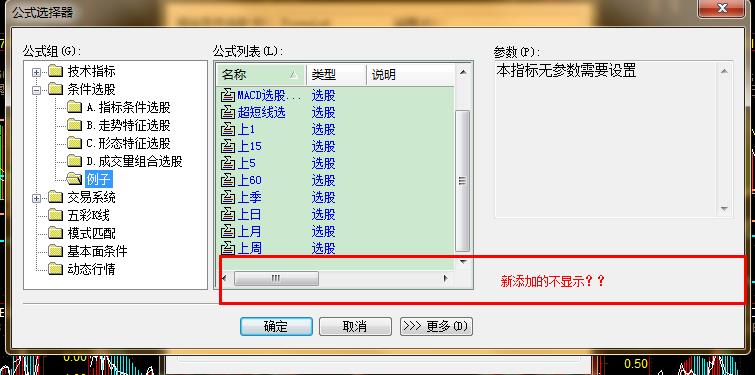 我新添加的条件选股公式,,确定是条件选股公式,而且也没错,,,,怎么在组合条件编辑列表中不显示呢?
