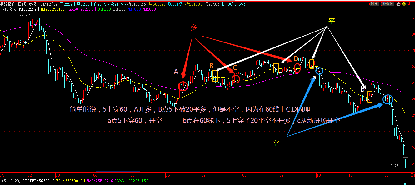 5均线下穿60均线开空,60  20  5呈现空头排列,60均线下,5金叉20平空,再次死叉,继续开空进场