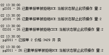 simnow模拟 ,今天  下午13:30:00 4个品种发单,都被simnow服务器拒绝。和早上9:00:00的一模一样。前一段还发现尾盘漏单估计也是这个原因。