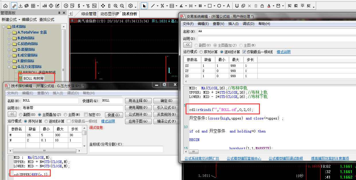 是的,布林线它们都在一个指标里。难道我放了个基础严重错误。。。。抱歉老师,我是没半点基础的那种学员。请教我一下,我这个怎么修改修改?谢谢!意思是不是要先新建一个小时线的boll指标,然后再在1分钟线的策略里使用小时线的指标?