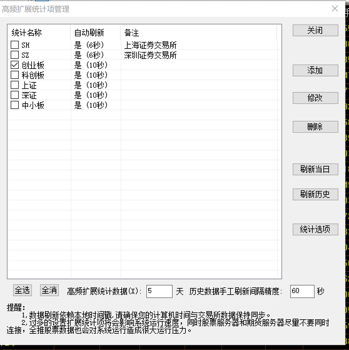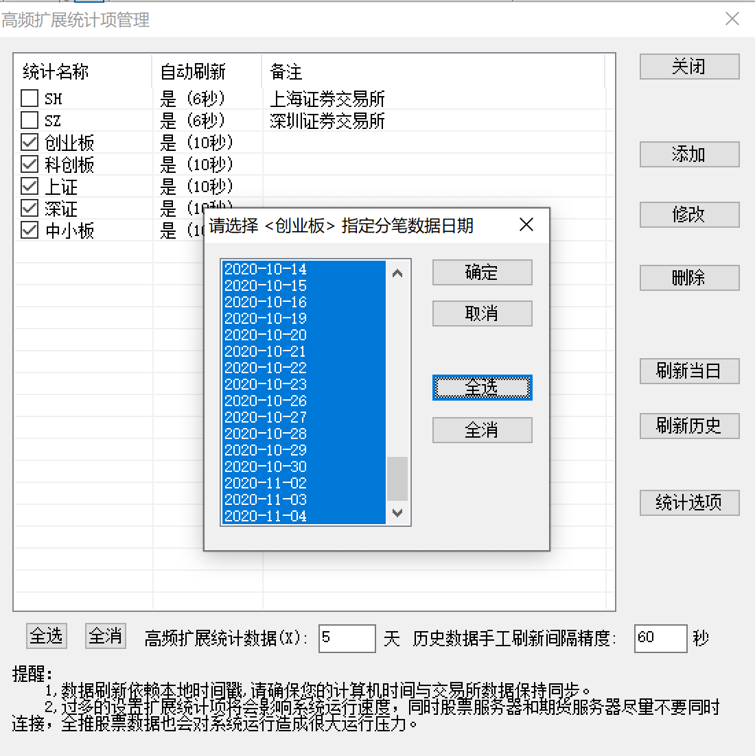 我添加了上海A股、深圳A股、创业板、科创板、中小板等5种数据源,但是一点“刷新历史”,就程序无响应,然后崩溃了。我一次只选一个,然后点刷新历史程序也崩溃。必现。我用的是信达证券版,window10。设置界面截图如下: