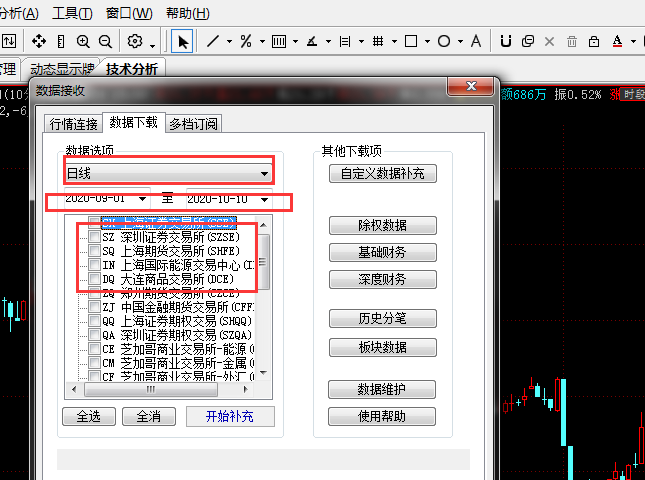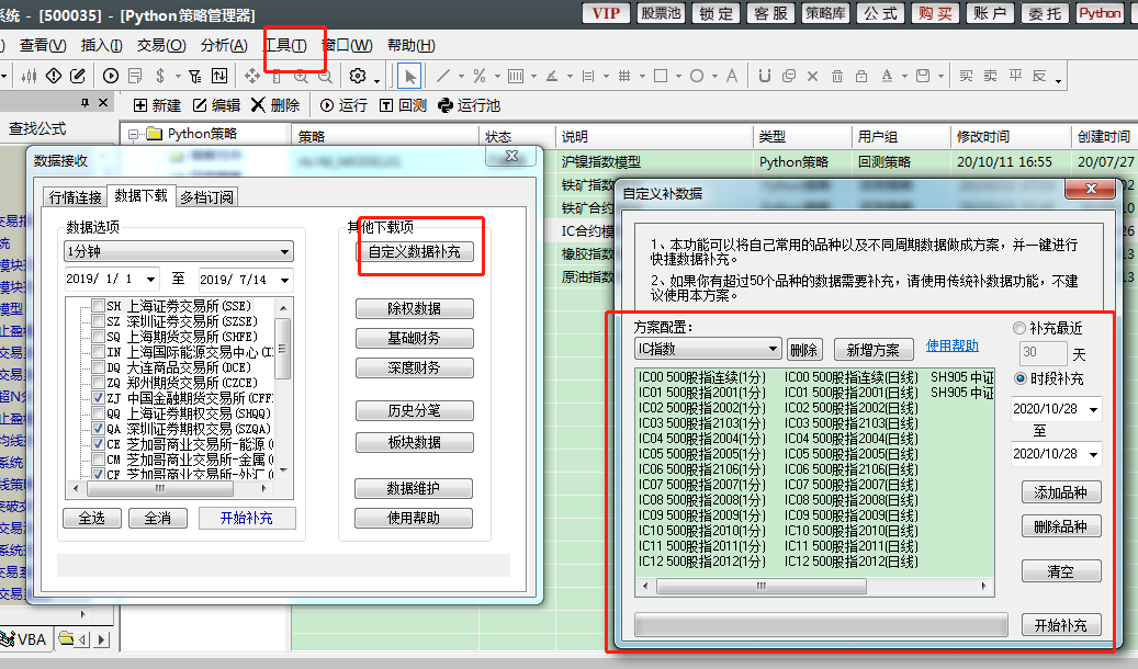 按照附件截图(工具-自定义数据补充)所示的数据补充当日数据(尤其是1分钟),发现数据不全,有些合约的未补充到。通过到相应的合约后,K线图上方的数据补充后可以,数据完整。