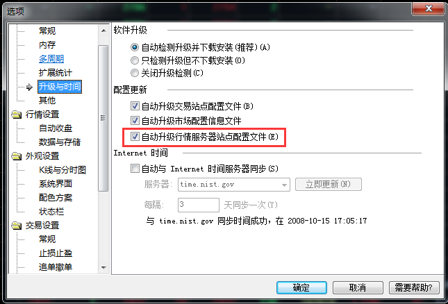 点击工具---选项---升级和时间,勾选自动升级行情服务器站点配置文件,如下图: