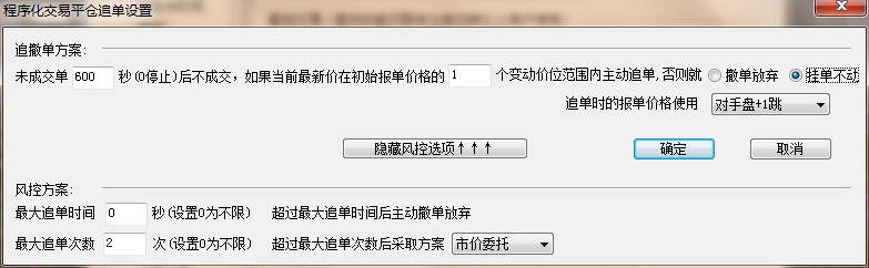 追单2次之后,如果仍不成交就启用风控:以市价委托反复追单直到平仓。