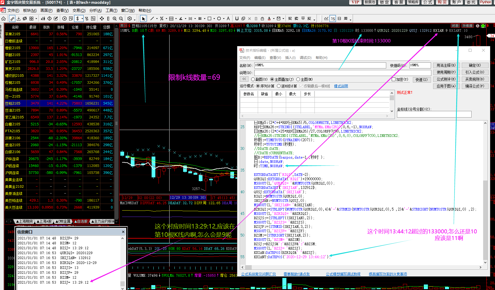 十字光标处,b数=barpos=10,整个画面的bar数=C数=datacount,十字光标处对应的K线结束时间TIME=13:30:00(barpos=10,对应北京时间:09:30),图片点击可在新窗口打开查看图片点击可在新窗口打开查看对应的时间是13:29:12,应处于第10根K线内,KXIAN应该=10,不应=9,
