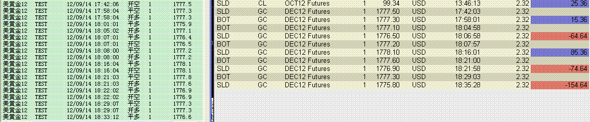 请看图,在金字塔的交易记录中都有(看黄金,9轮交易全部有记录),但实际在TWS中(看GC)只成交了5轮,其余4轮涉及反手的,都没有成交;