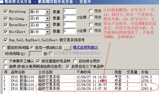 小时级别模型,中午关了一下,11:36打开,发出一开仓指令,见不是正确的指令,马上关掉系统。准备等开盘再开系统。13:07分打开,又发出开仓指令。但这根K线还没走完,这2次信号不应该发出指令的。几次碰到这样的情况了,不知是否BUG,怎样解决!