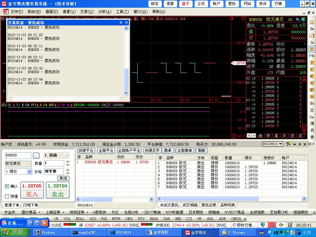 随便设个条件: 比如5日均线上穿10日均线,市价买进1份欧元美元(比如1楼的成交价1.28690,数量为100000),成交后在1.28660挂上止损卖单,在1.28720挂上止盈卖单。