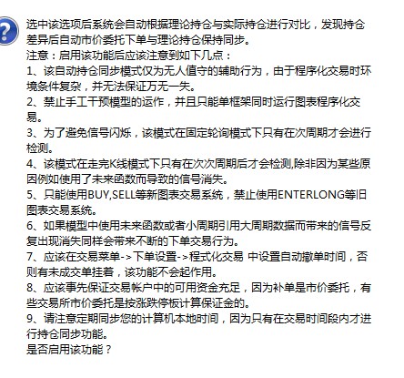 自动持仓同步是会在你每根K线的次周期都会进行真实持仓与理论持仓的同步检验并矫正,目前这是推荐给用户的操作方法,但是该功能目前还存在一定的危险性,比如客户的策略如果无法保证信号的稳定,可能会给客户带来很大的安全隐患,最常见的就是会不断的开平仓.