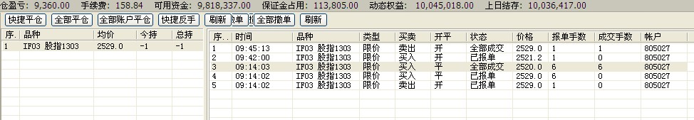 2013-03-14 09:45:13.640    【回报】805027 : IF03 全部成交 1 价格:2529.0 开 卖