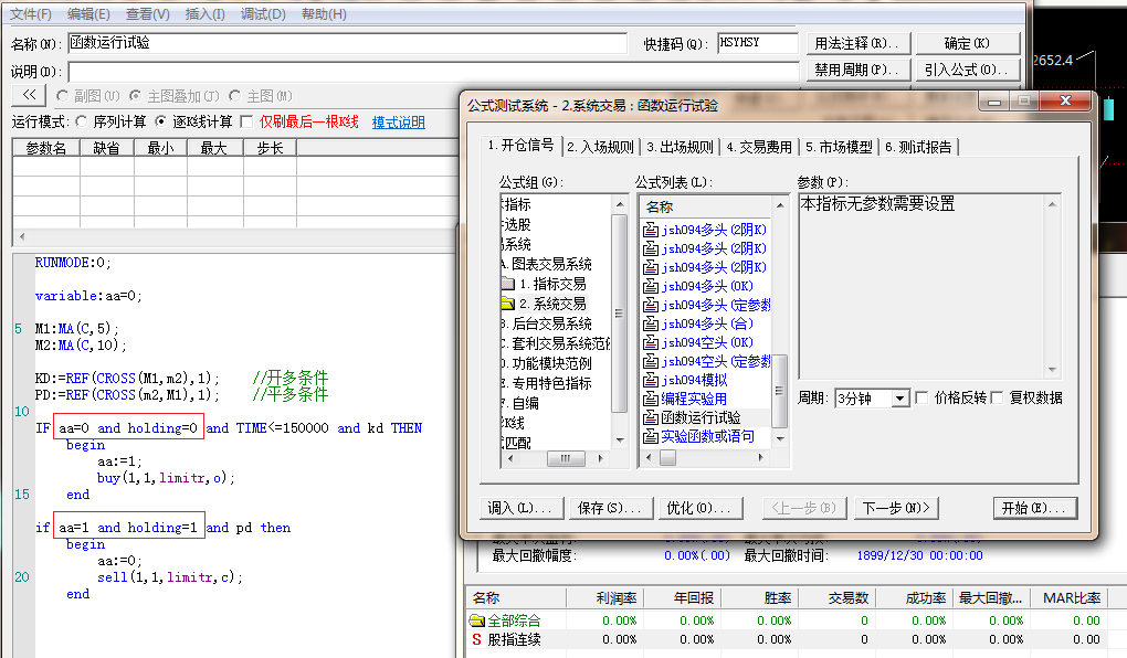 您就用这个代码,回测一下,交易是零。如果把aa=0 and holding=0改成(aa=0 or holding=0)也有交易。