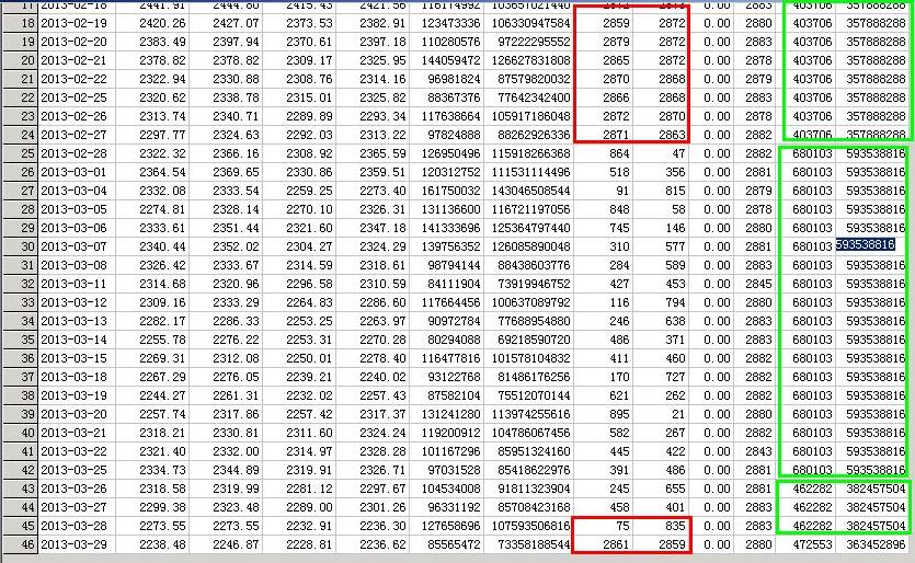 2、绿色框,是“开盘量”、“开盘额”,我理解是上证指数开盘竞价时的成交量和额对不?怎么总是出现连续好多天一模一样的阿?有问题吧?
