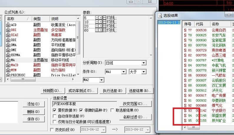 我在通达信是查找 沪深300中,MA5大于MA10的有几个如下图: