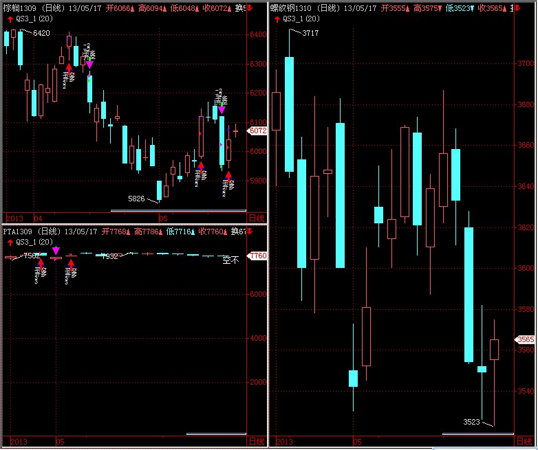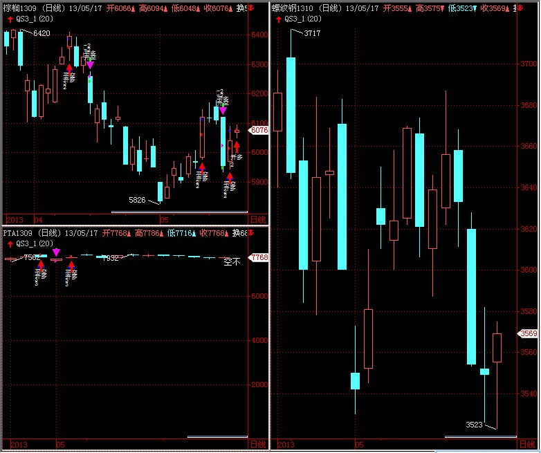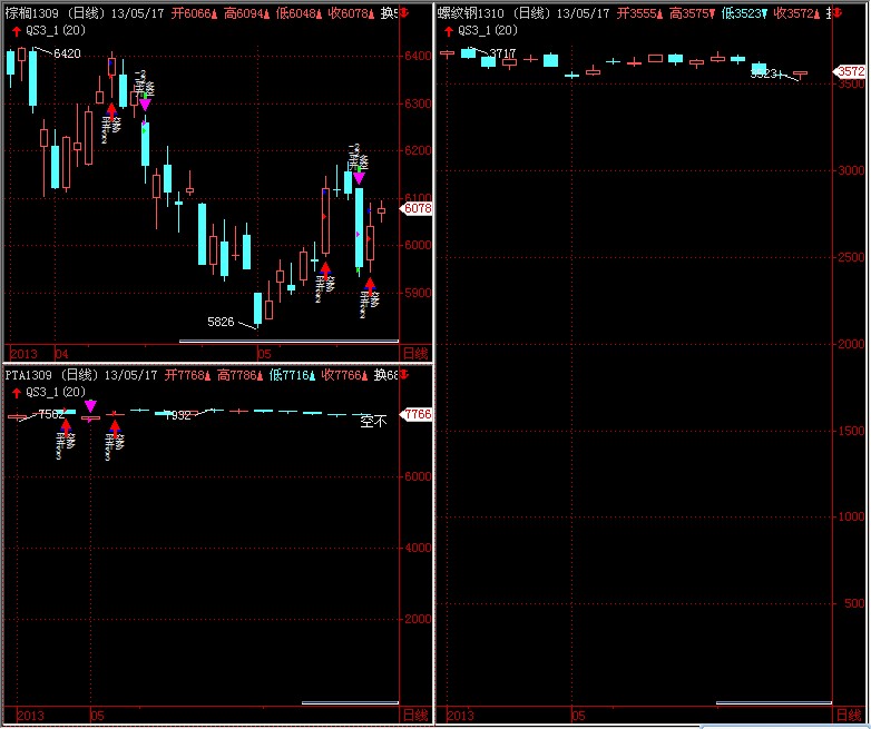 刚刚截的图,在双击加载右边螺纹钢图公式的时候,在左下角的pta窗口最后一根k线出现了空开信号,而我的空开信号代码如下: