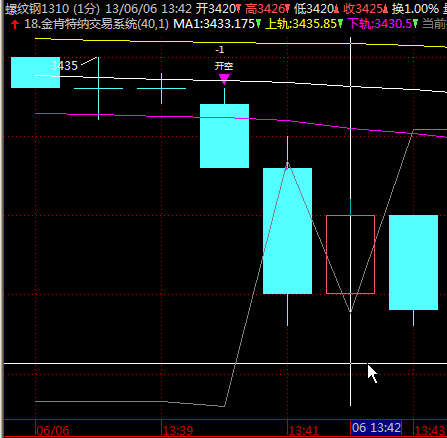 3、本例中:“ 9、2013-06-06 13:41:00.187    【回报】805856 : RB10 全部成交 1 价格:3428 开 卖”,表示在13:41--13:42这个时间段的前1秒的第187毫秒成交,那么在k线图上,应该在13:42那根k线的open成交,13:42那根k线的open=3420,不是3428。而图示的开仓信号、开仓价位显示没错;记录单中显示的模拟成交价位也没错,但前面的“2013-06-06 13:41:00.187 ”时间显示错了。这是什么原因?