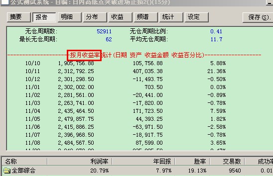 测试“报告”中能否求出每日收益情况。“报告”中只有每月收益率统计,“统计”中虽然可以调整出每日,但是因为数据太多无法看到数据。请问这个测试“报告”中怎样看出每日收益情况。或者怎样得出每日收益情况的数据。