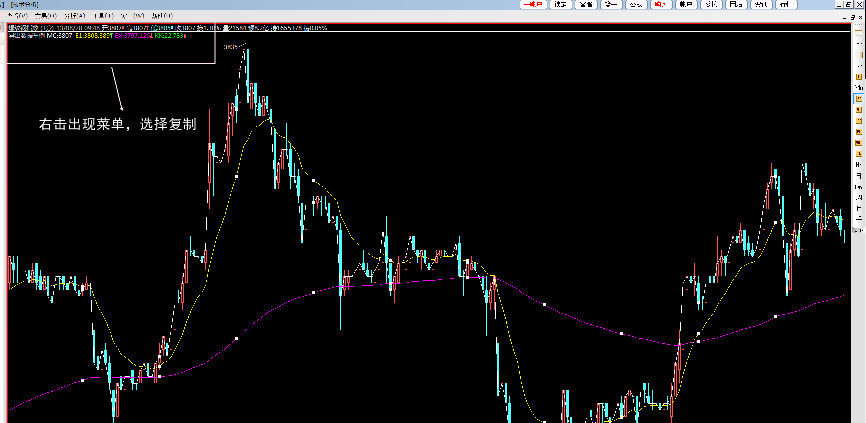 例如,我要导出螺纹钢5分钟的收盘价,以及13日均线价格,首先编写如图