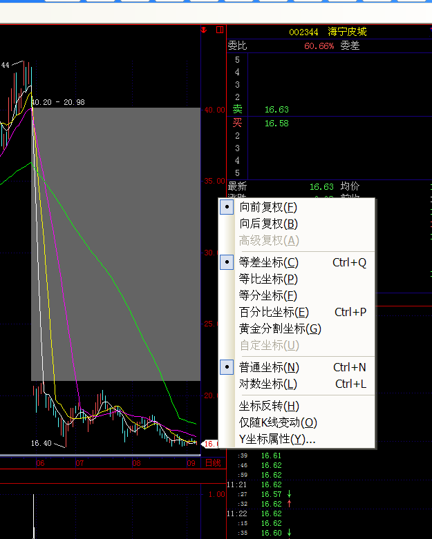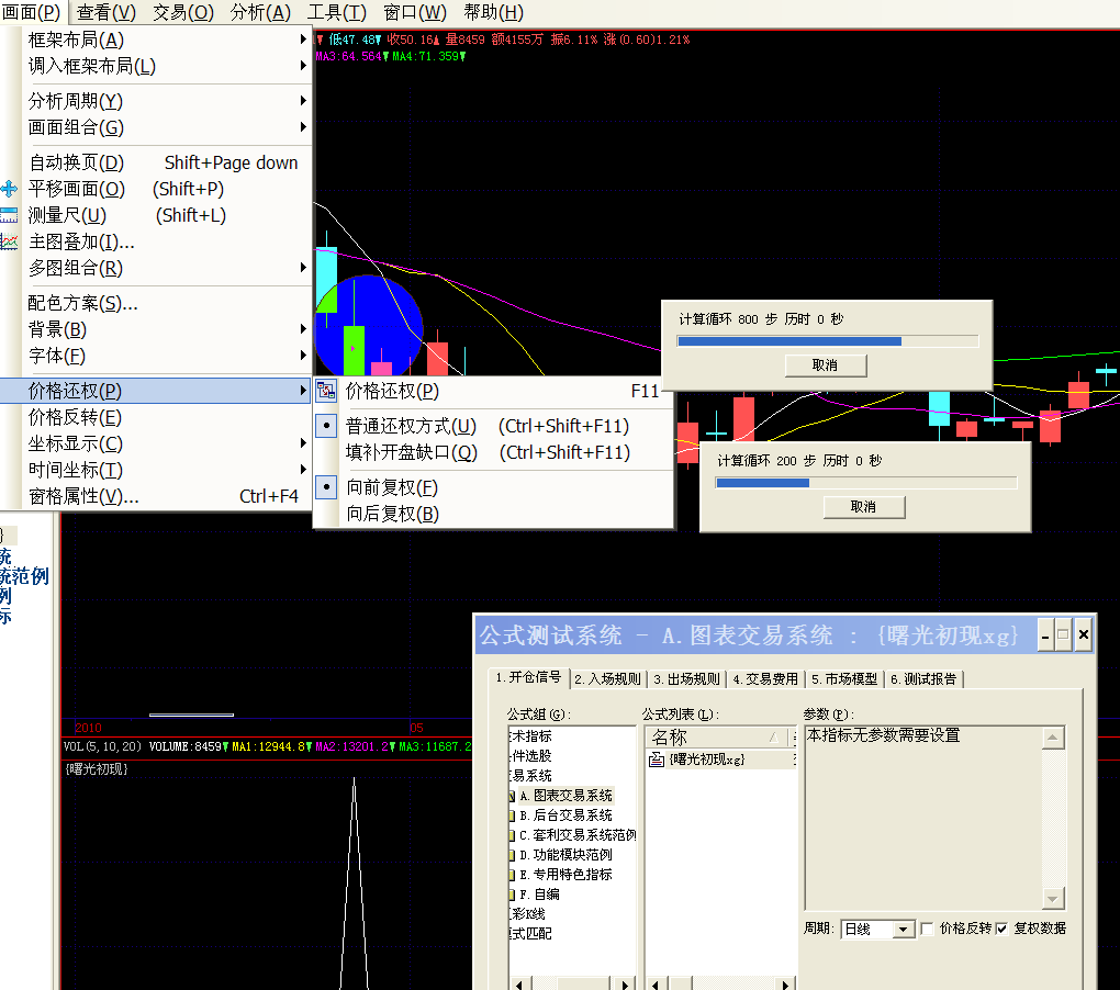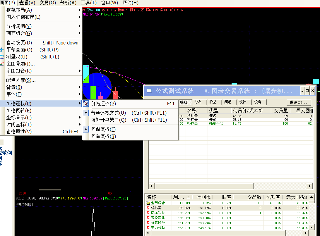 如图,鼠标右键也选择向前复权了,菜单也选择向前复权了,评测也选择复权了