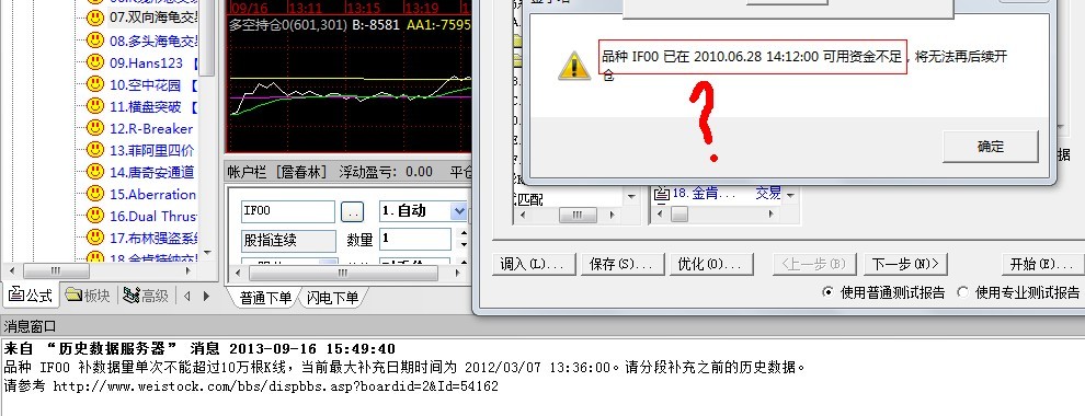 资金改为50万,可2010.4.16当天就说资金不足,无法继续开仓。这个不对吧?另外,我在一楼的问题请教老师解答