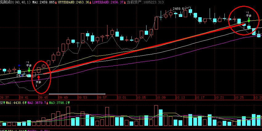一个信号是图表根据计算得到的开平信号,一个是模拟程序实际发出的信号。二者时间上差别不小。