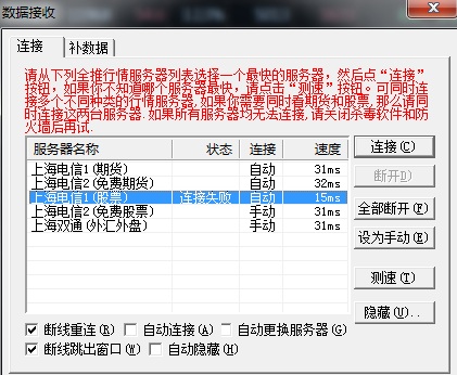 不知道为什么,盘后补充分笔就是不行,电信股票1,老是提示连接失败。电信股票2一补充,就提示断开。测个速吧,还很快,电信股票1 15MS 电信股票2 31MS