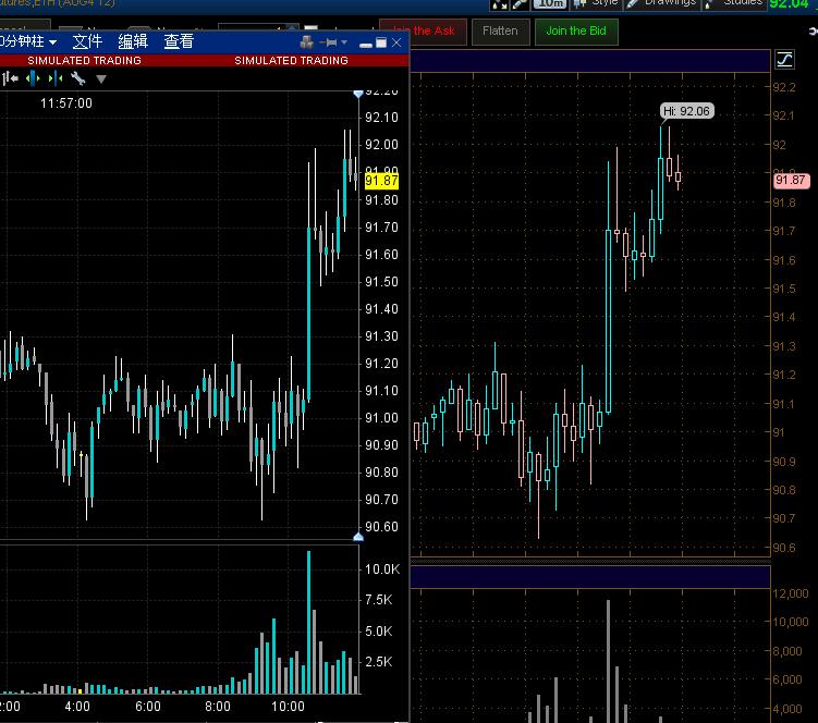 看看今天晚上的比较,CL的10分钟K线,金字塔的数据全部错位,上图,左边TWS、右边TOS;下图是金字塔的