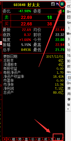市盈率、每股收益等财务数据可以通过切换至页面右下角的“财”中查看,如下图;