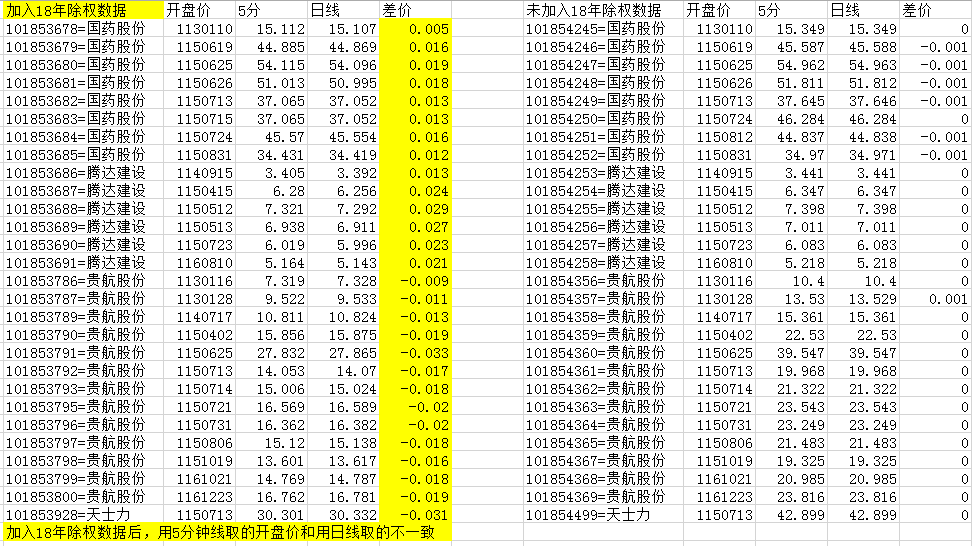 主题:加入18年除权数据后,用5分钟线取的开盘价和用日线取的不一致