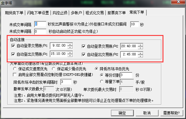 因为柜台那边会做结算,所以会导致账户断开;您可以看下金字塔的自动连接账户功能,交易》下单设置》常规下单,登入登出账号1为早盘时间,账户2为设置夜盘登入登出时间