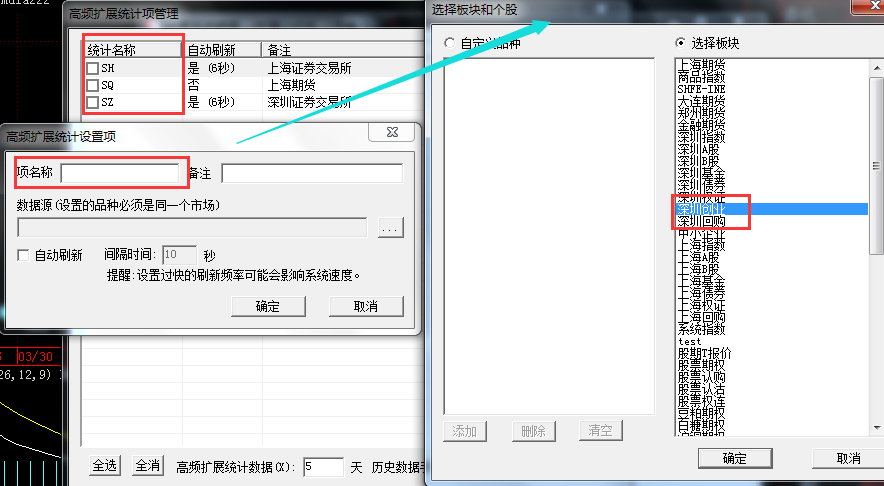 ALLTICKA 这个函数的SH是指高频扩展统计中的名称,您如果需要创业板,可以在扩展统计中新建一个创业板的板块,自定义一个名称
