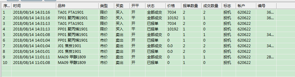 2018-08-14 11:00:54.446    【下单】MA09 价0.000000 量1 买卖1 类型1 开平0 账户620622 Formula 1