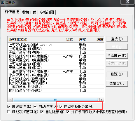 可以在数据接收界面勾选“自动更换服务器”的选项;当某个服务器断开后可以自动切换至其他行情服务器
