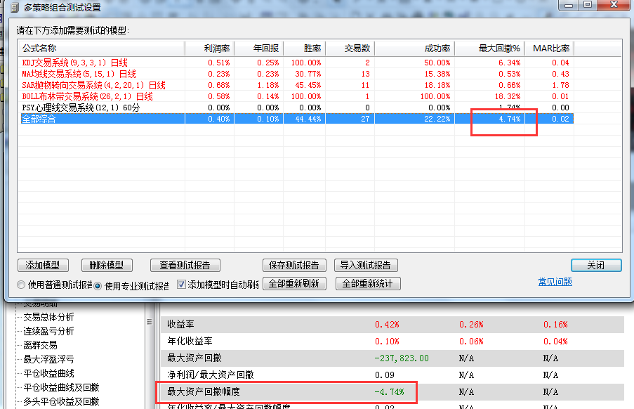 为什么多策略组合测试设置中的全部综合的最大回撤%和 打开后的组合测试报告里的最大资产回撤幅度数值不同,前一个是38%,后一个是-4.37%,导致mar比率也不同,前一个是0.32,后一个是2.79。是计算方法有什么不同吗?不是年份设置问题,设置了相同的年份而且3个品种都有的年份,还是数值不同。