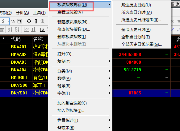 板块指数只能刷新历史日线数据,分钟数据只能是当天自己刷新,然后自己积累保存