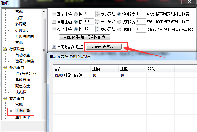 2、然后在分品种设置中再单独对某个品种设置固定止损的值; 固定止盈和移动止损同理。