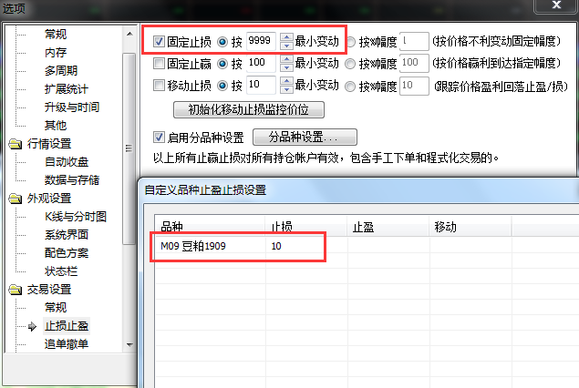 比如想设置豆粕单品种10点个止损,需要先在上方设置个极大值(比如9999),然后在设置自定义品种10点止损