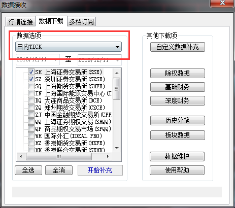 工具 》 数据补充 》 补充下日内tick试试;
