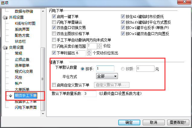 2、也可以根据品种设置默认下单数量;交易 》 下单设置中