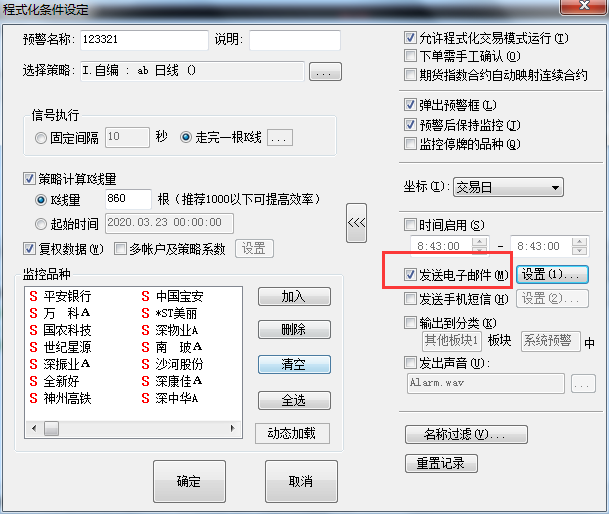 邮件设置看下该教程,还需勾选发送邮件 :http://www.weistock.com/bbs/dispbbs.asp?BoardID=2&ID=157458&replyID=&skin=1