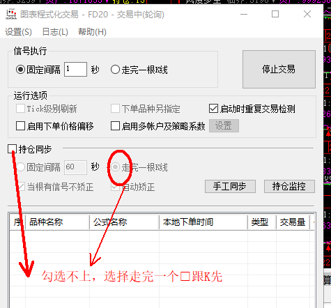 多个品种如果在单个框架中,可以使用持仓同步功能;而如果使用了多框架功能,只是使用 持仓监控的功能,持仓监控目前只能固定时间刷新,您可以把间隔时间设置的和K线图周期时间一致,然后在该周期K线生成的第一秒手动点击,大致可以实现走完K线才同步的功能