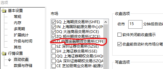 你好,我勾选了期货市场如下图5个自动补充市场分笔收盘,但是到了自动收盘的时候系统只补充分笔收盘了4个,红色圈起来那个没下载收据也没自动收盘,有时候又会过五六分钟自动补充分笔收盘,这是什么问题呢