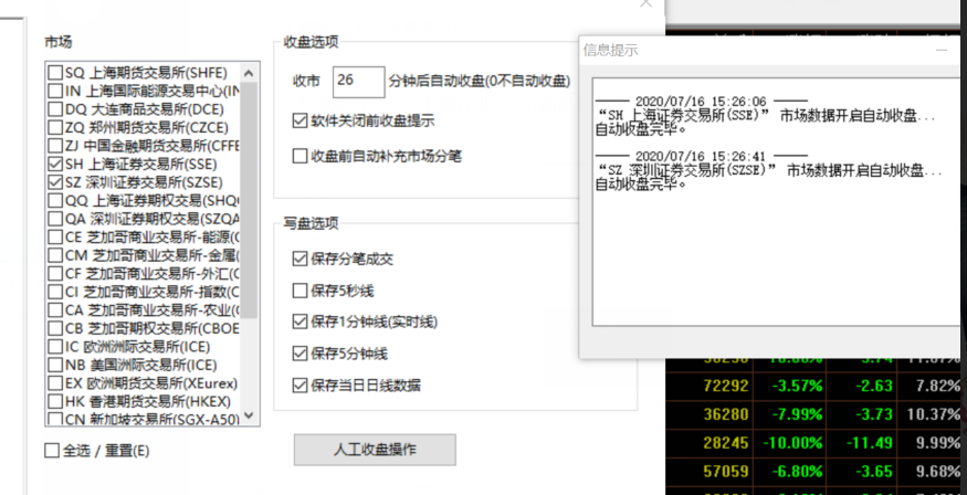 手动收盘处理的方式: 工具 》 数据管理 》 数据管理器 ,选择相应市场执行收盘即可;
