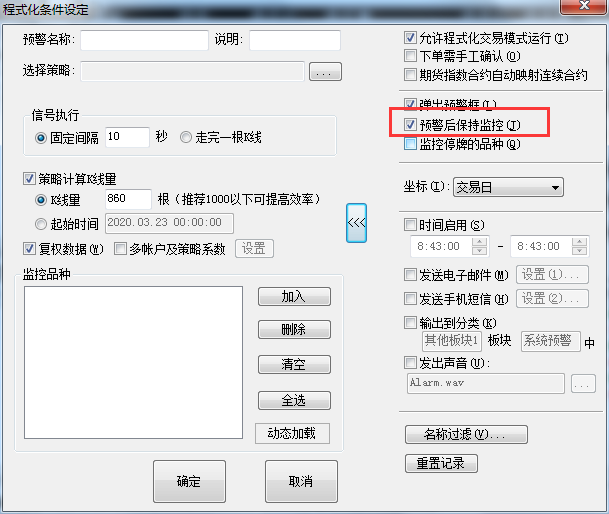 2.你要在本地预警设置中,勾选“预警后保持监控”才能重复预警