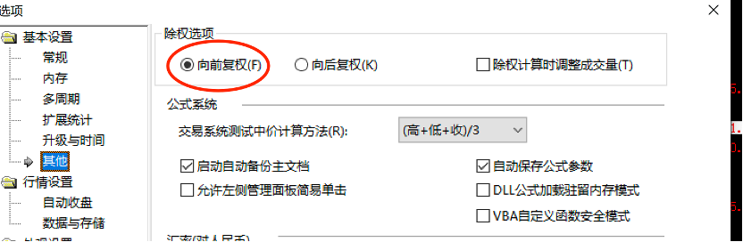 这个是我的工具选项中前复权设置的截图: